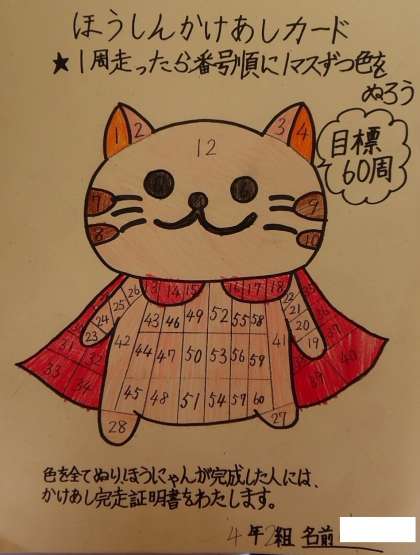 かけあし週間もそろそろ終わりに近づいてきたので、目標の60周に到達した子も出てきました。たくさん走って強い体をつくりましょう。