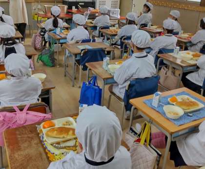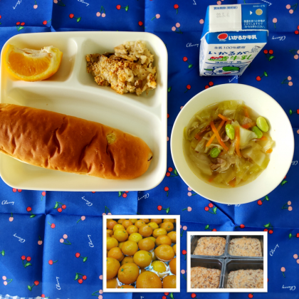 今日の給食は、「押し麦のグラタン、豚肉と野菜のスープ、いよかん、おさつパン、牛乳」です。
