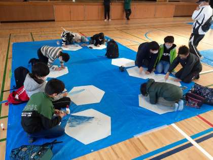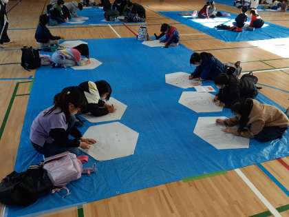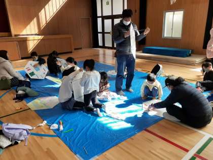 凧あげ大会にむけて、講堂で凧づくりをしています!
