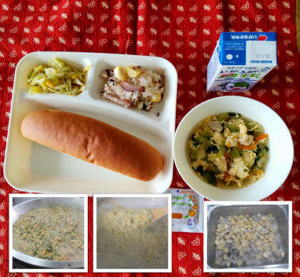 今日の給食は、「中華おこわ、卵スープ、キャベツのオイスターソースいため、コッペパン、アプリコットジャム、牛乳」です。