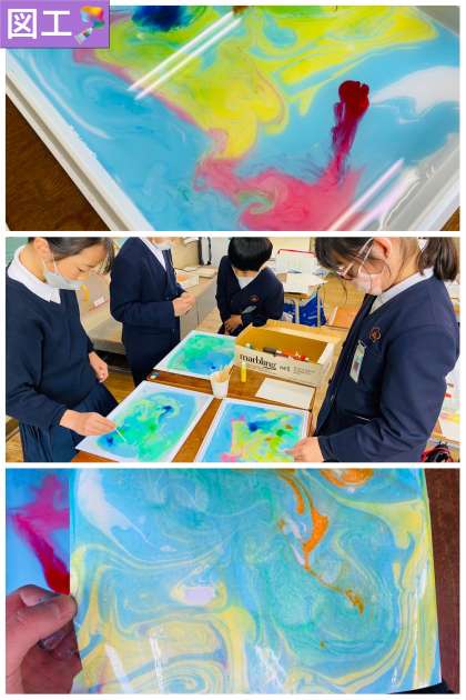 「色々なぎほうをつかい、もようをかこう」をめあてに学習しました。ふき流し・スパッタリング・デカルコマニー・マーブリングといったぎほうをしました。今回の学習の感想を紹介します。