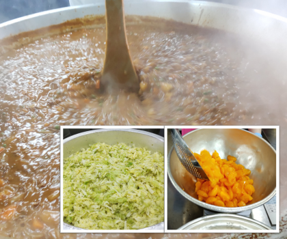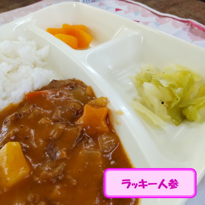 今日の給食は、「ハヤシライス、キャベツのバジル風味サラダ、みかん(缶)、牛乳」です。