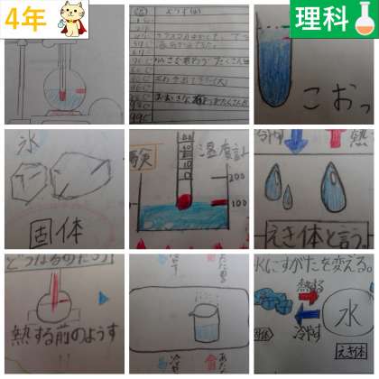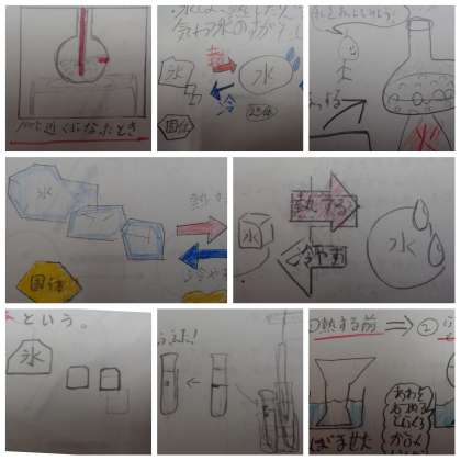 『水のすがた』の単元でまとめノートを書きました。水が熱したり、冷やすことで個体や気体に変化することを上手に表現することができました。
