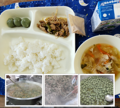 今日の給食は、「豚肉と野菜のいためもの、すまし汁、きな粉よもぎだんご、米飯、牛乳」です。