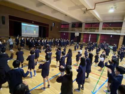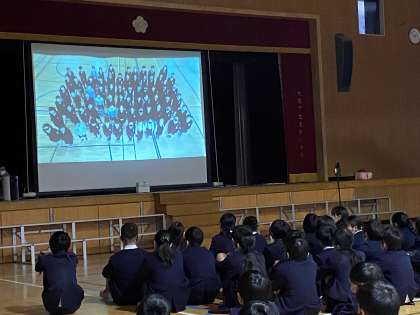 1、5年生が講堂で、2年生から4年生まではオンラインで教室から参加しました。