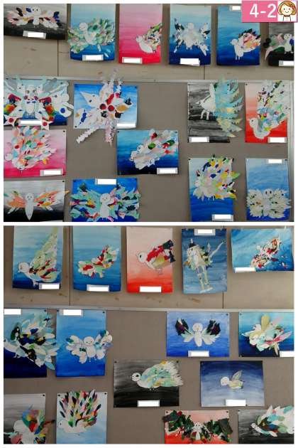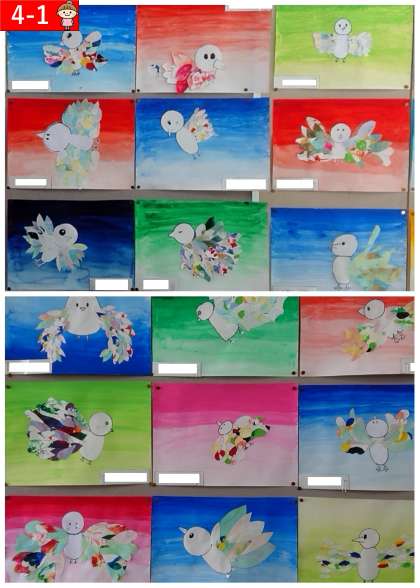 羽の大きさを調節したり、羽が重なるようにしたりして上手に完成させた鳥を各クラス掲示しています。