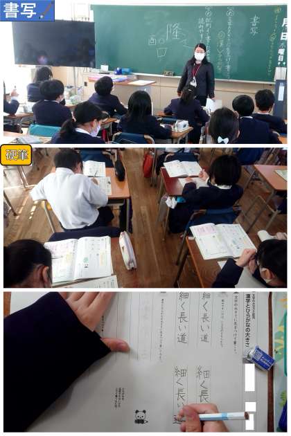 「文字の大きさに気をつけて書こう」と「配列よく書くための方法を考えて読みやすくしよう」をめあてに学習しました。『ごんべん』の形を整えることが少し難しかったみたいです。