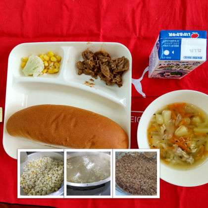 今日の給食は、「豚肉のデミグラスソース、スープ、カリフラワーとコーンのサラダ、、コッペパン、バター、牛乳」です。