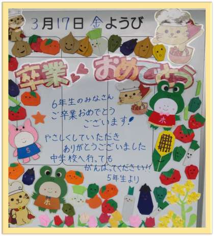 献立黒板には、明日卒業式を迎える6年生のみなさんへ、5年生の給食委員会さんからのメッセージが!
