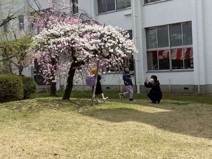 雨も上がり、色鮮やかに咲き誇る桜をバックに・・・。