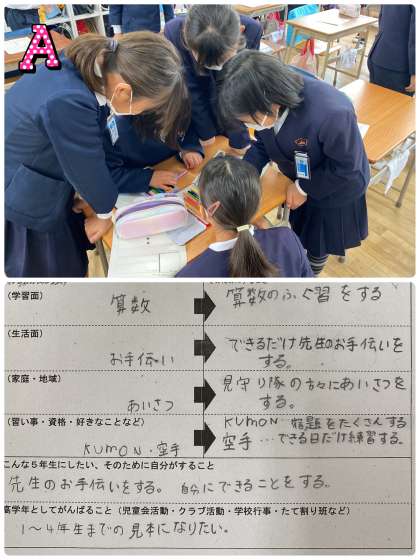 Aグループは学活で係活動やキャリアパスポートを記入しました。高学年の仲間入りをした5年生。がんばりたいことには、「たてわり班活動でわかりやすく教えたい」「1〜4年生の見本になりたい」と高学年の自覚を持った目標を立てている子が多かったです。