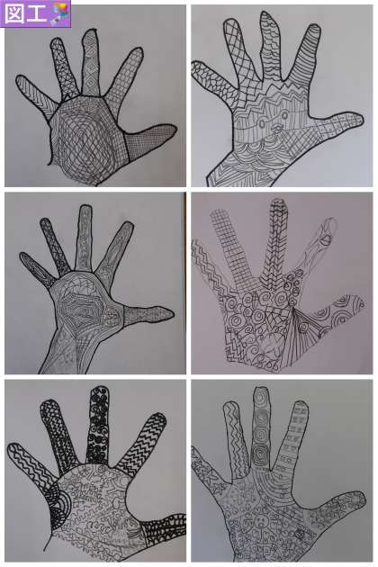 開いた手をなぞってから、自分のオリジナルのもようを組み合わせてかきました。指の種類によってもようを変えているのでおもしろい絵に仕上がりました。次回の学習では、色をぬっていきます。