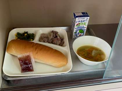 今日の給食は豚肉のガーリック焼き、スープ、さんどまめとコーンのサラダ。