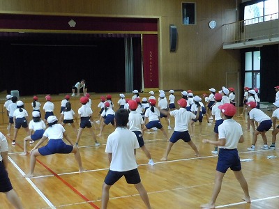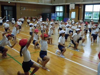 運動会で発表するダンスなのでしょうか、舞台上の先生の動きに合わせて、振りを次々に覚えていきます。