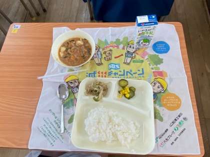マーボー豆腐好きーと言いながら、楽しそうに食べていました。返却する時にはおいしかったと言うと声があり、調理員さんも大変喜んでいました。