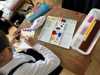 図工では、絵具を使って混色に挑戦しました。赤と青の混ざり具合でうすい紫や濃い紫になることに気付くことができました。様々な色の使い方を覚えて作品作りを頑張ってほしいと思います。