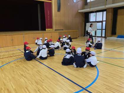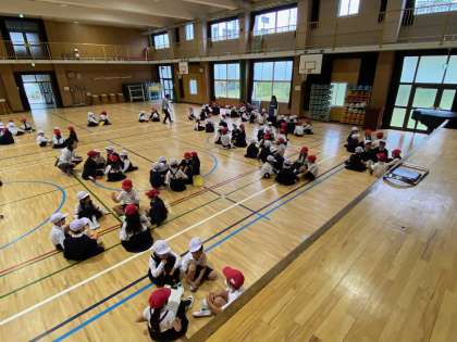 講堂に集まってきた1、2年生。グループを作ってまずは自己紹介です!
