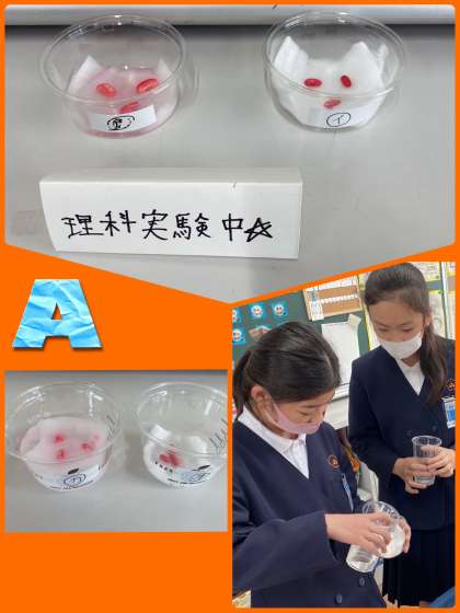 各学級でインゲン豆の実験をしています。水を与えたものと与えなかったもの、暖かい場所と冷たい場所など条件を決め、植物が発芽するために必要なものは何かを探っています。どの条件のインゲン豆が発芽するのか楽しみです☆