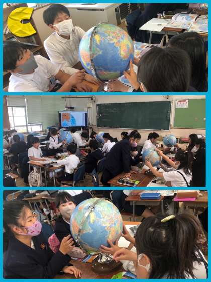 社会では地球儀を使い、日本が地球のどの位置にあるか探しました。また日本の近くにある国や聞いたことのある国を地球儀から探しました。教科書載っている大陸や海洋の名前を知るとともに、地球は陸地より海が多いことを聞き、驚いている子どもが多かったです。