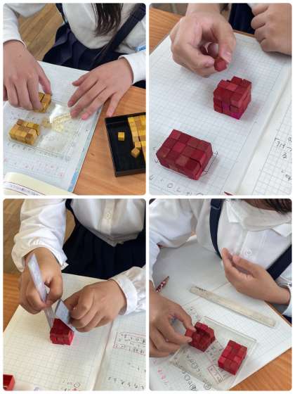 1㎤という体積の単位を知り、1㎤の大きさの積み木を触り、その小ささに驚いていました。また問題である箱の体積を求めるために、1㎤の積み木を積み上げて、どれくらいの大きさなのかを調べました。