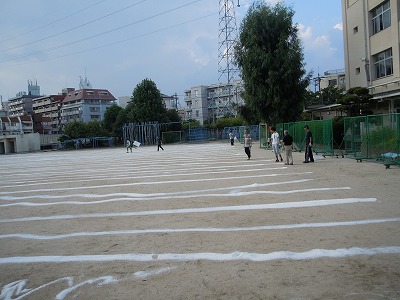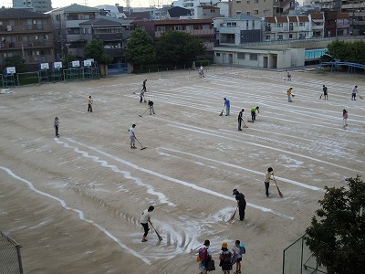 放課後に先生方総出で運動場に「にがり」をまく作業をしました。