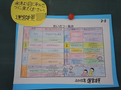 また、先週の給食の時間には、運営委員さんが各教室を回って、あいさつ週間の掲示物を持ってまわってくれていました。