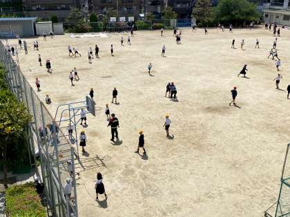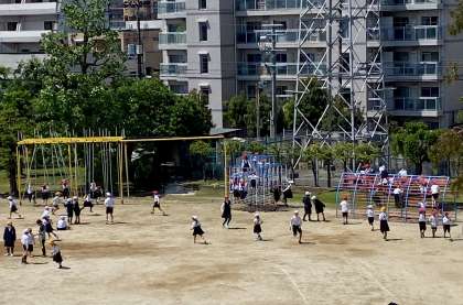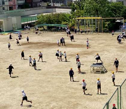 良い天気に誘われて運動場に登場です。思い思いに友だちと過ごす大事な時間です♪