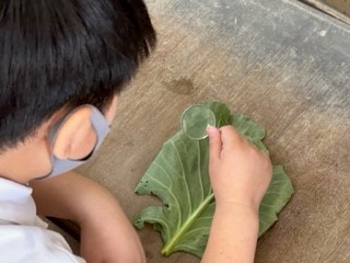 豊新小学校の学習園にあるキャベツ畑で以前捕まえたモンシロチョウの卵が孵り、たくさんの幼虫が出てきました。3年生の教室で育てている虫かごの中を朝覗いてみると…なんとさなぎになっていました!朝から、興味津々に虫かごを眺めている子がいました。今日の理科の学習では、幼虫の観察で一人ひとりが虫眼鏡を使って細かいところの模様までみて、絵に描いていました。気づいたことに、「周りから白い薄い毛が生えている」「ところどころに黒い点々がついてる」など書いてる子がいました。