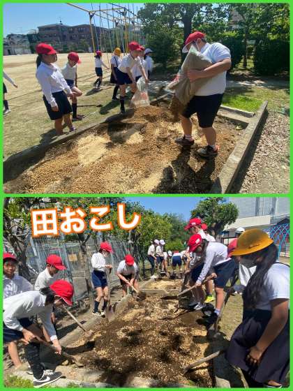 5年生は来週稲を植えます。そのために雑草抜き、田おこしをグループにわかれて行なってきました。この日は黒土、赤玉土、鹿沼土を入れ混ぜていく作業をしました。スコップで掘り起こしながら混ぜていくのに力が要りますが、お互いに励ましあってやり切りました。