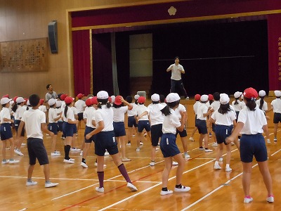 4年生が運動会に向けて講堂でダンスの練習をしていました。