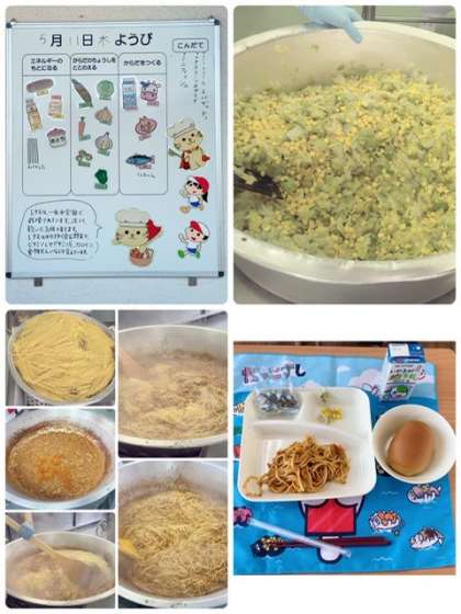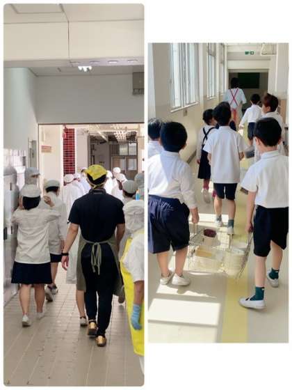 1年生は、給食に慣れてきて、重たい食器も持てるようになってきました。