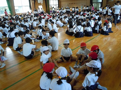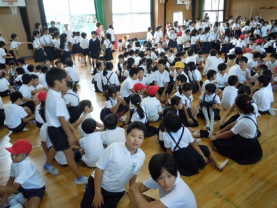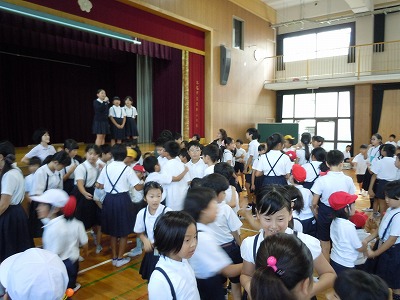 今朝の児童集会は、運動場が不良のため講堂で「人数集め」を行いました。