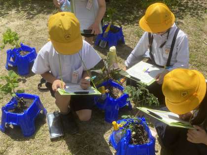 生活科では、先週植えた野菜の観察をしました。「ナスははじめから紫なんだね」「枝豆の葉っぱは丸いね」など、友達の苗との違いを楽しみながら取り組みました。