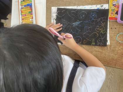 図工では、クレパスを使ってスクラッチをしました。画用紙をカラフルに塗りつぶし、その上からさらに黒で塗りつぶします。それを削ると…きれいな模様ができました!「わ〜きれい!」という声が聞こえました。