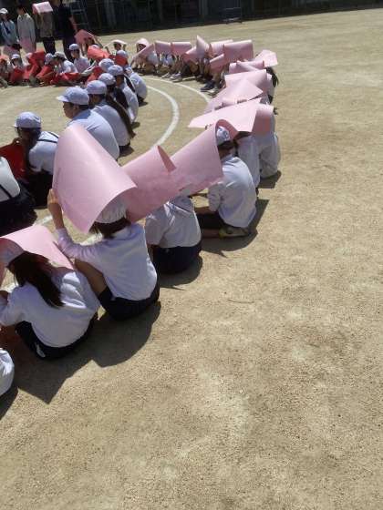 金曜日には、50周年の関連で航空写真を撮りました。2年生はピンクの画用紙を掲げました。校章のどの部分になっているかな?出来上がりが楽しみです。