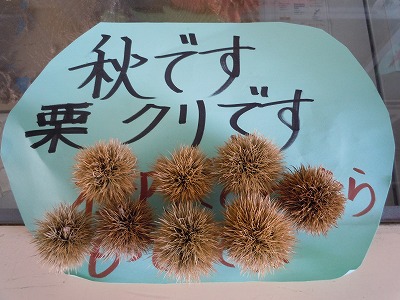 理科室前には、子どもたちが豊新の森から拾ってきた「栗(クリ)」が並べられていました。