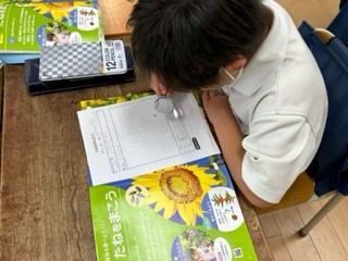 たねをまこうの単元に入りました。今日は、マリーゴールドの種とホウセンカの種の観察をしました。4月に学習した虫眼鏡を上手に使い、細かいところまできっちりと観察カードに記録していました。定規を使って、「ちょうど1mm!」など意欲的に観察することができました。気づいたことには、「マリーゴールドの種の形がイメージしていたものとちょっと変わってる。」「丸いものもあれば、長いものもある」などたくさん書いていました。これから、学年で育てていきます。無事に成長してくれることを祈ります。