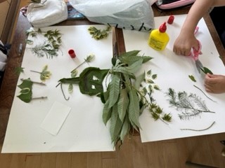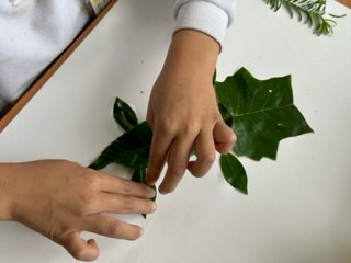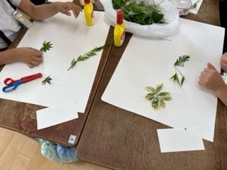 作品作りが進んできました。今日、いろいろと教室内を周っていると…可愛い猫のようなものが出来上がっていました。他の子のも見てみると、枝についている葉っぱを上手く使って表現したり、葉っぱに葉っぱを重ねて顔を作ってみたりなど、いろんな工夫が見られました。とても楽しそうに取り組んでおります。この後、パスや絵の具を使って隙間に線を引いたり、色を塗ったりして完成となります。完成が楽しみです!