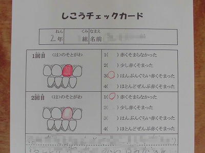 朝の歯みがきで残っていた「歯垢(しこう)」を赤く反応させる薬を歯に塗ってもらい、みがき残しを確認しました。
