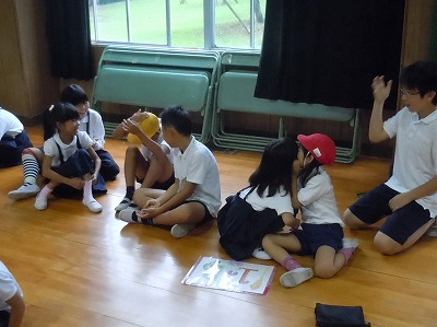 今朝の児童集会は講堂で「伝言ゲーム」を行いました。