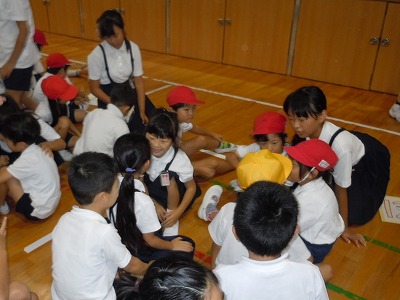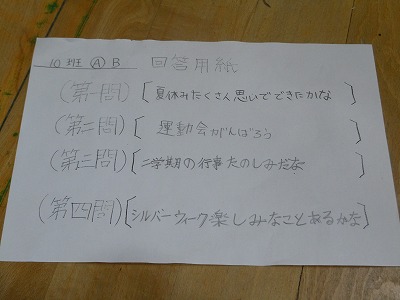 各班の先頭が、集会委員の元へ「ことば」を聞きに行き、次へ次へと小声で伝えていきます。