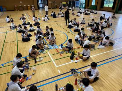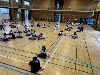 4年生は講堂に集まって思い思いの仲間とともにランチタイムです♪
