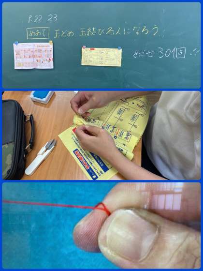 裁縫の授業が始まって2回目の今回は「玉止め、玉結び名人になろう」をめあてに取り組みました。