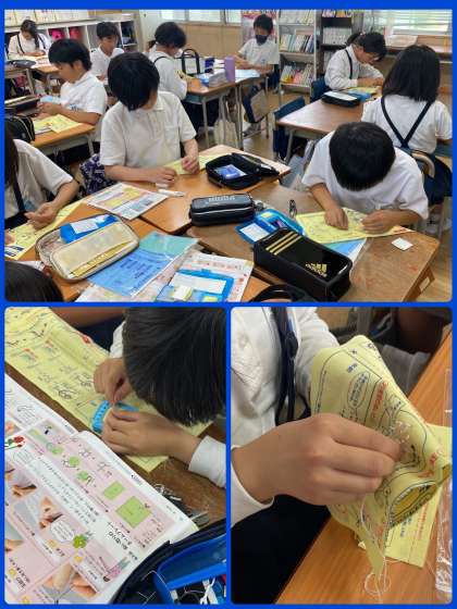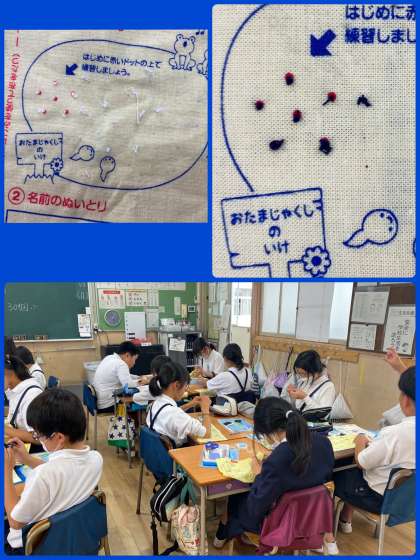 お手本動画や教科書のやり方を見ながら指に糸を巻き付け、玉結びをしていきました。玉止めの方は苦戦する児童が多く、「針に糸を巻き付けその部分を抑えながら針を引っ張っていく」動作がなかなかうまくいきませんでした。しかし班で励ましあい、アドバイスしあいながら時間の最後まで取り組むことができました。