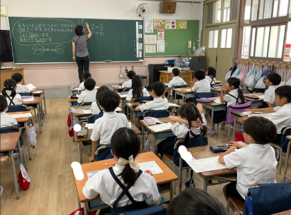 1年生、『たしざん』の学習が始まりました。ノートにめあてを書いたり、問題を書いたり、式と答えを書いたり一生懸命取り組んでいます。