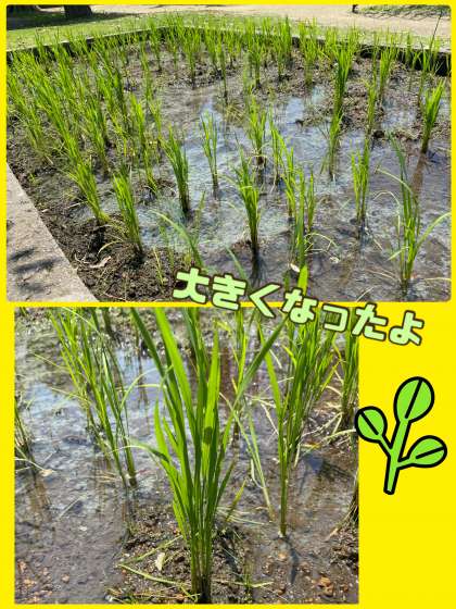 10cmほどだった稲が今では20〜25cm程に成長しました。毎日水やりや雑草抜き、害虫駆除を学校に朝早めに来てしてくれている子や休み時間にしてくれている子がいます。