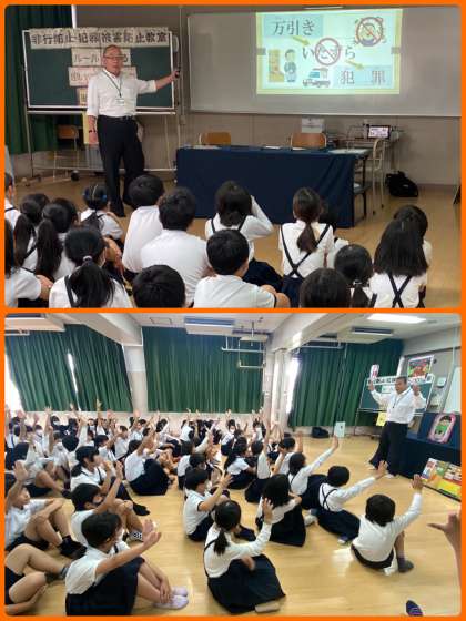 外部講師の方を招き、非行防止教室を行っていただきました。傘で友達をたたいたり、髪の毛をひっぱったりすることは犯罪であると教えていただきました。