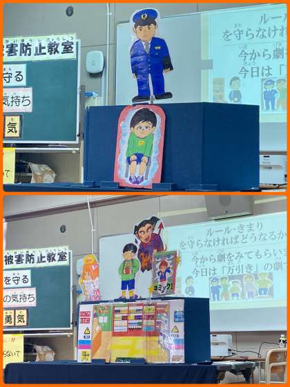 結局悪魔が勝ち、万引きをしてしまい、謝っても許してもらえず警察や家族を呼び出され指導される男の子の姿を見て、「家族を傷つけたり、周りに迷惑をかけたりすることはしない」と振り返りに書いている児童が多かったです。