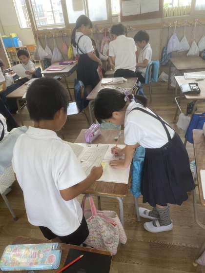 国語では、「ことばで絵をつたえよう」という学習をしています。三角や四角、丸など簡単な図形を組み合わせた絵のかき方を、言葉で説明します。
