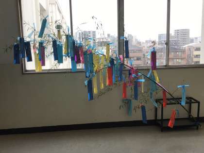 6年1組の学級会係の児童が自主的に七夕の笹飾りを作りました。